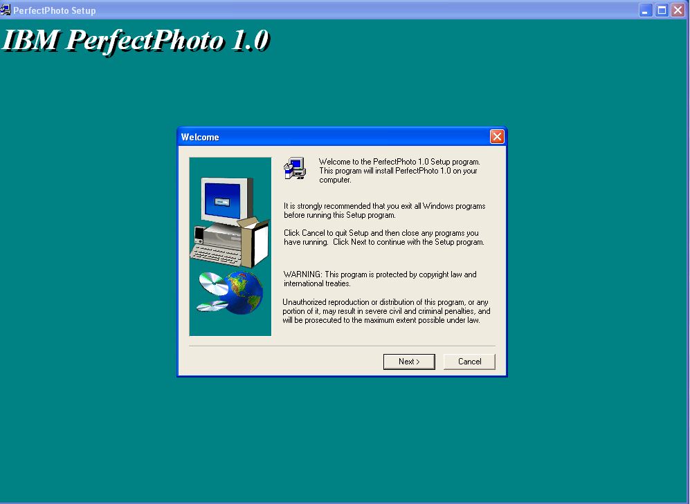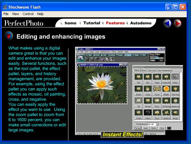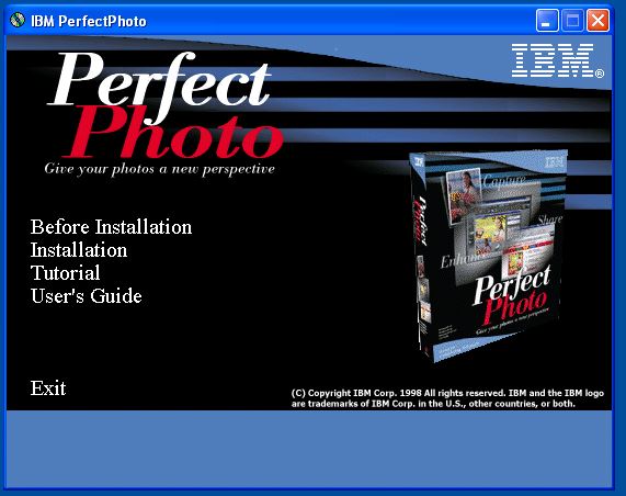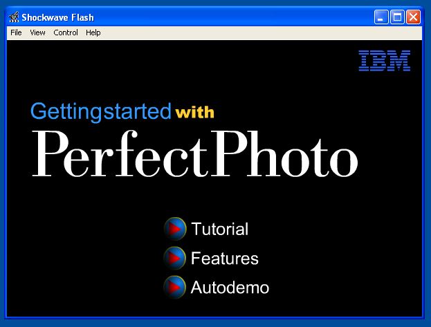 Before we jump straight into the installation, I think it might be time to review the second menu option Tutorial which starts a delectable Shockwave Flash (version 3.0) program titled Getting started with PerfectPhoto in the IBM design style of the time. From here there are three options Tutorial, Features and Autodemo.